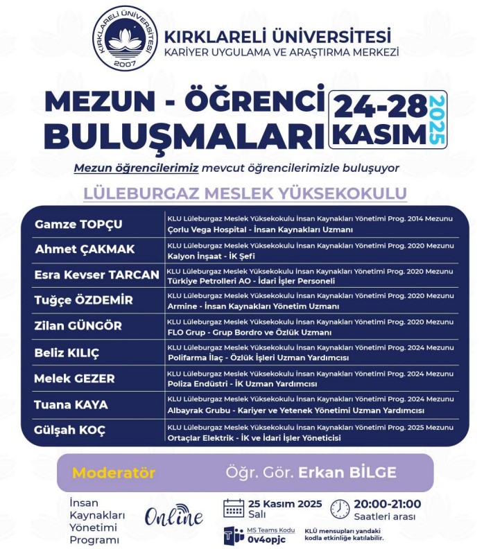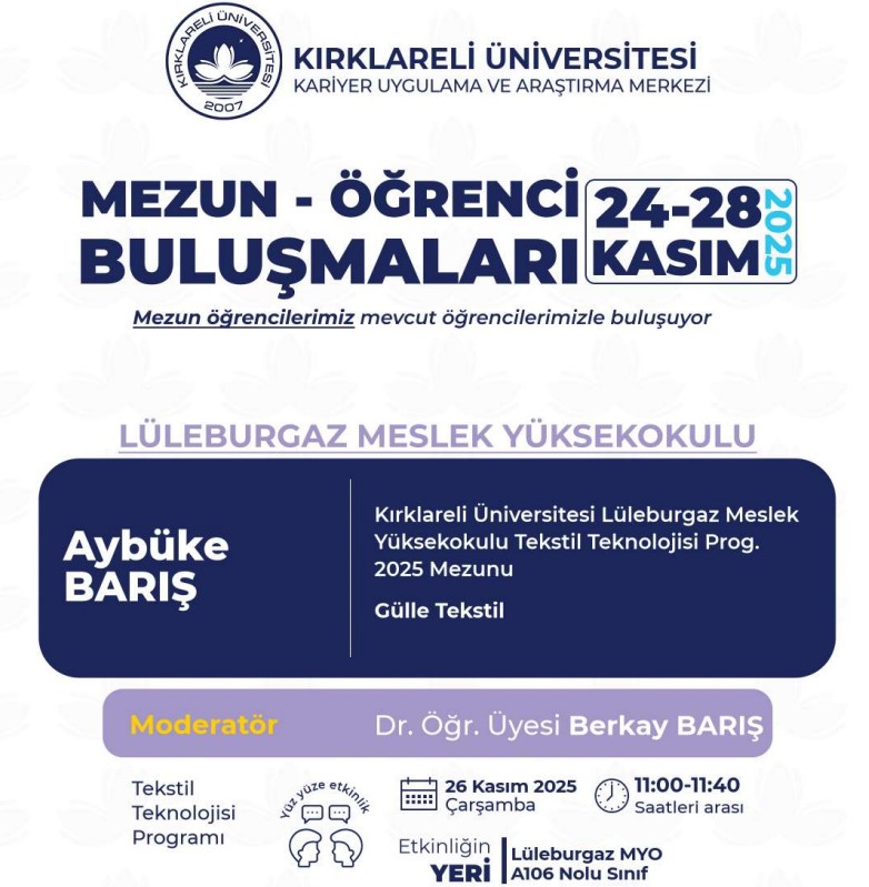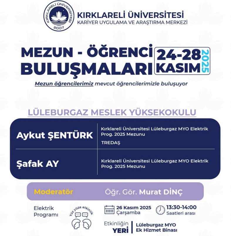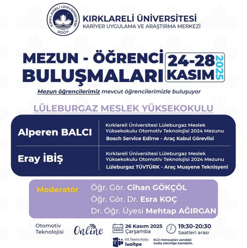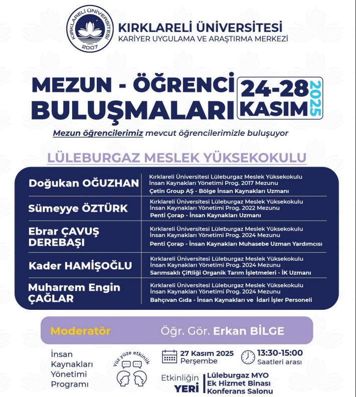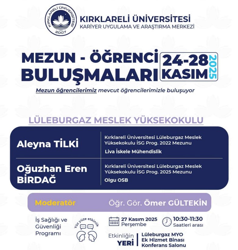 Kariyer Uygulama ve Araştırma Merkezimize bağlı olarak faaliyet gösteren Kırklareli Üniversitesi Mezunlar Ofisi koordinatörlüğünde akademik birimlerimizin katkısıyla 2025 -2026 Eğitim Öğretim Dönemi "Mezun Öğrenci Buluşmaları" etkinlikleri düzenlenecektir. Organizasyonun amacı mezun öğrencilerimizi, mevcut öğrencilerimizle buluşturmak, “Kırklareli Üniversitesi Öğrencisi” ve “Kırklareli Üniversitesi Mezunu” kimliklerinin sağlamlaşmasına katkıda bulunmaktır.