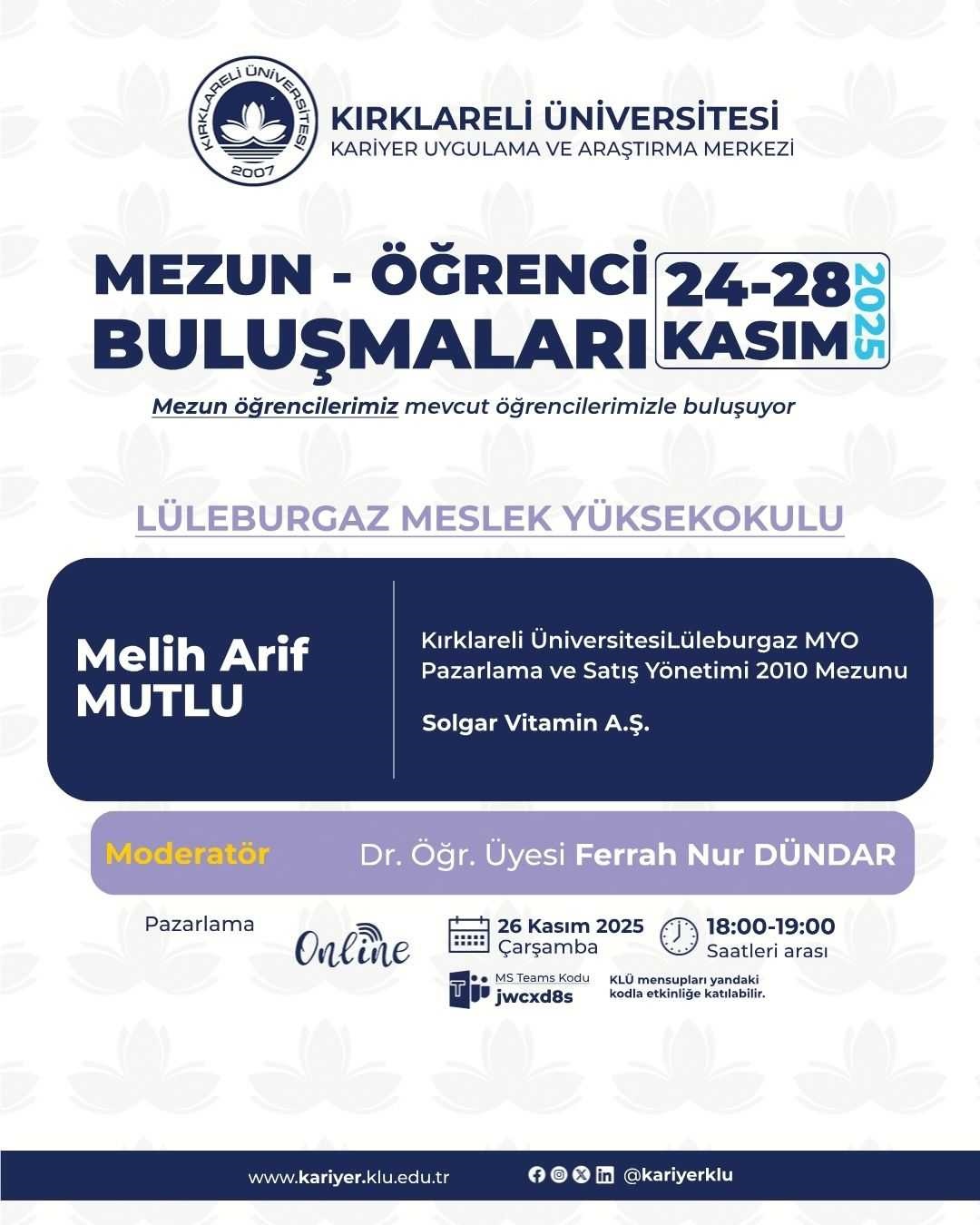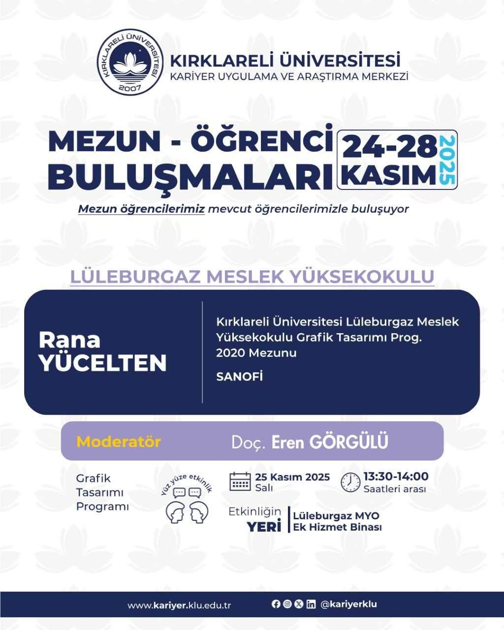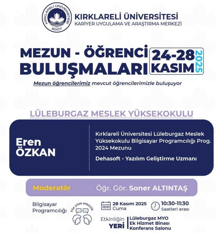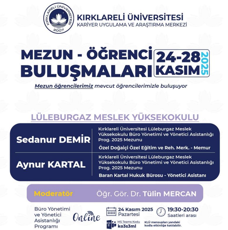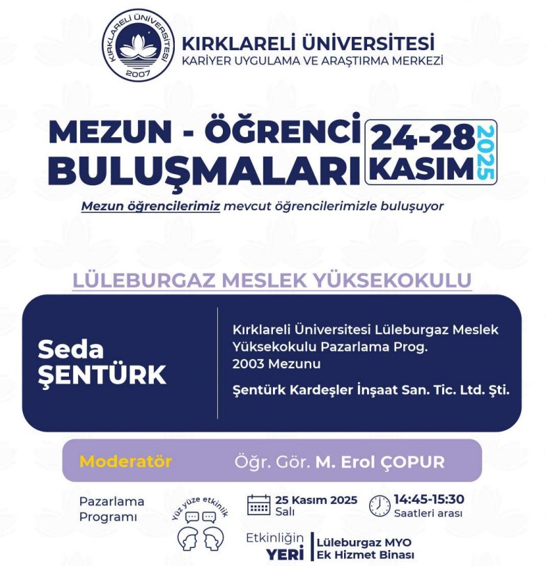 Kariyer Uygulama ve Araştırma Merkezimize bağlı olarak faaliyet gösteren Kırklareli Üniversitesi Mezunlar Ofisi koordinatörlüğünde akademik birimlerimizin katkısıyla 2025 -2026 Eğitim Öğretim Dönemi "Mezun Öğrenci Buluşmaları" etkinlikleri düzenlenecektir. Organizasyonun amacı mezun öğrencilerimizi, mevcut öğrencilerimizle buluşturmak, “Kırklareli Üniversitesi Öğrencisi” ve “Kırklareli Üniversitesi Mezunu” kimliklerinin sağlamlaşmasına katkıda bulunmaktır.